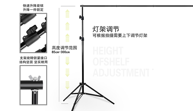 一款可以轻松安装且调节尺寸的背景架可以让你的拍摄更具多样性。轻松适配棉质、纸质、PVC等材质背景布,提供稳定一整天的支撑。